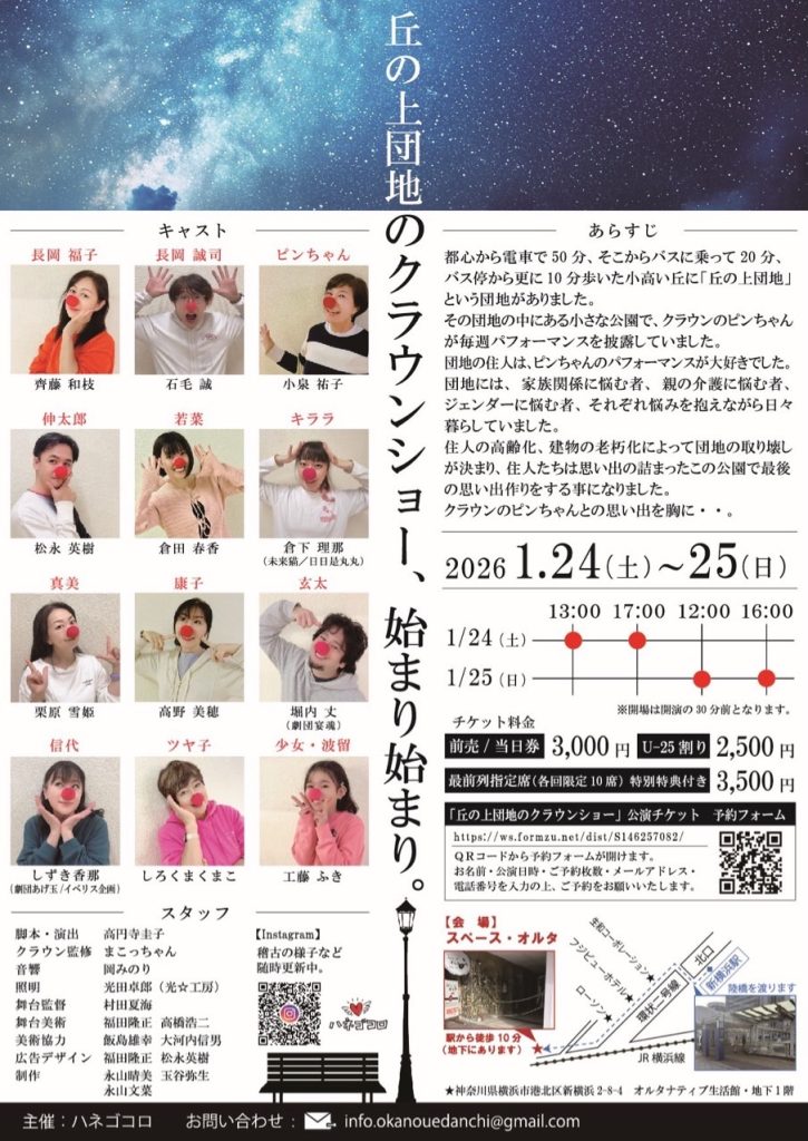 2019年、クラウンとしてプロ宣言をしたぴんちゃん。クラウンになるきっかけとなったまこっちゃんのもとで実習生としてマグカルナイトやホッチポッチに出演します。また同年にはクラウンカレッジ・ジャパン三十周年を記念した『クラウンばっかりフェス』も開催され、日本全国から大勢のクラウンが大集結する中ぴんちゃんも参加しました。この勢いでさらなる前進を図ると思いきや、突然やってきたコロナ禍による緊急事態宣言で活動休止状態に! それでもさまざまな工夫を凝らしクラウンの面白さをライブで届けようとするまこっちゃんとともに、クラウンユニットぴんちゃん&まこっちゃんとして数々のフェスに出演してきました。コロナを取り巻く社会情勢とともにパフォーマンスのやり方も変化し、その都度最良の方法でショーを繰り広げてきたぴんちゃん&まこっちゃんの、この五年間の集大成的なステージにご期待ください!